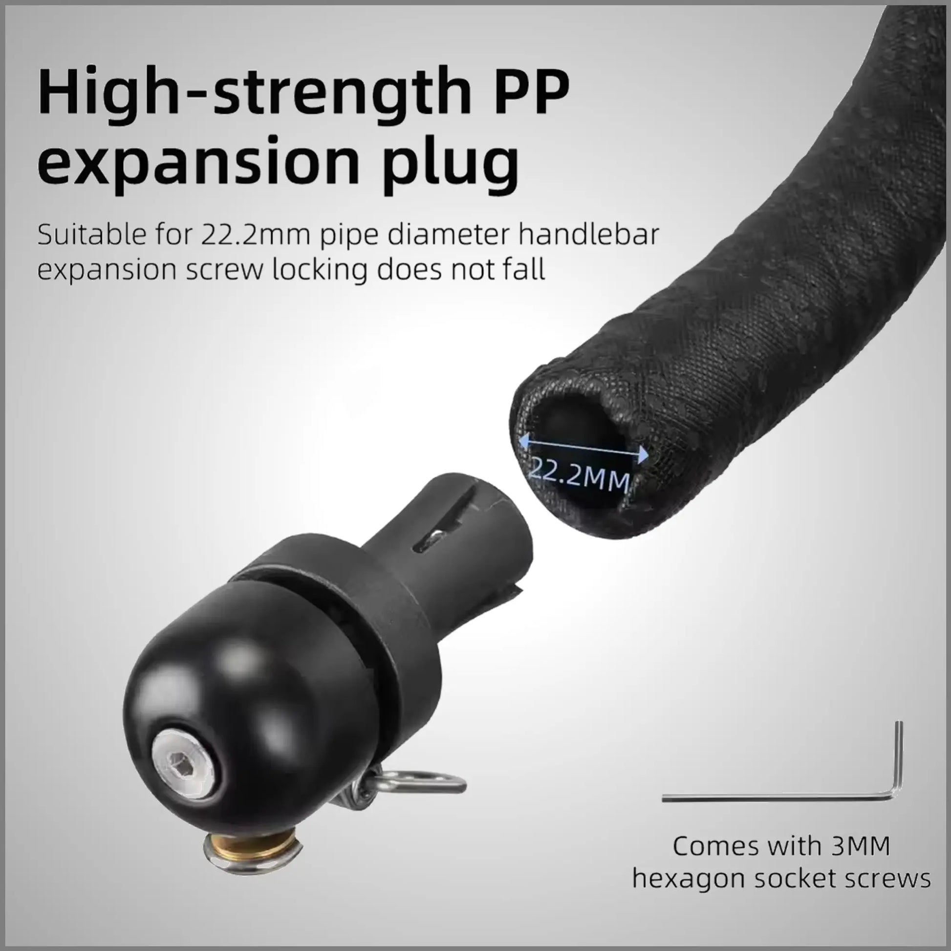 Mit nur 64 g Gewicht wird die Klingel über einen Spreizmechanismus befestigt – passend für alle gängigen 22 mm Dropbar-Lenkerenden. Der Druckmechanismus erzeugt ein klares, selbstbewusstes Ding, während das schwarz eloxierte Aluminiumgehäuse den Look schlicht und hochwertig hält.