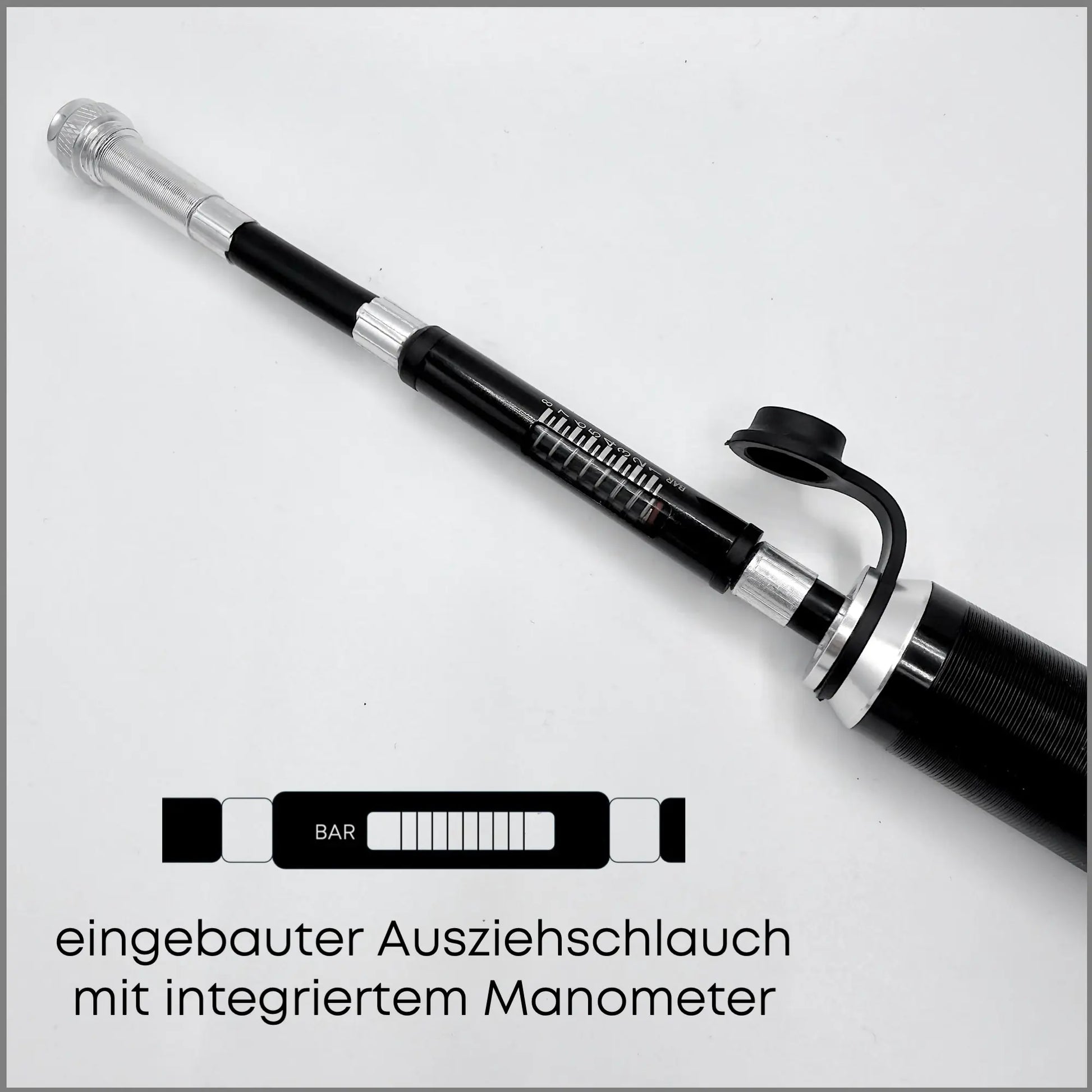 Das integrierte analoge Manometer zeigt den Reifendruck in BAR/PSI an und hilft dir, den optimalen Reifendruck schnell und genau zu erreichen.