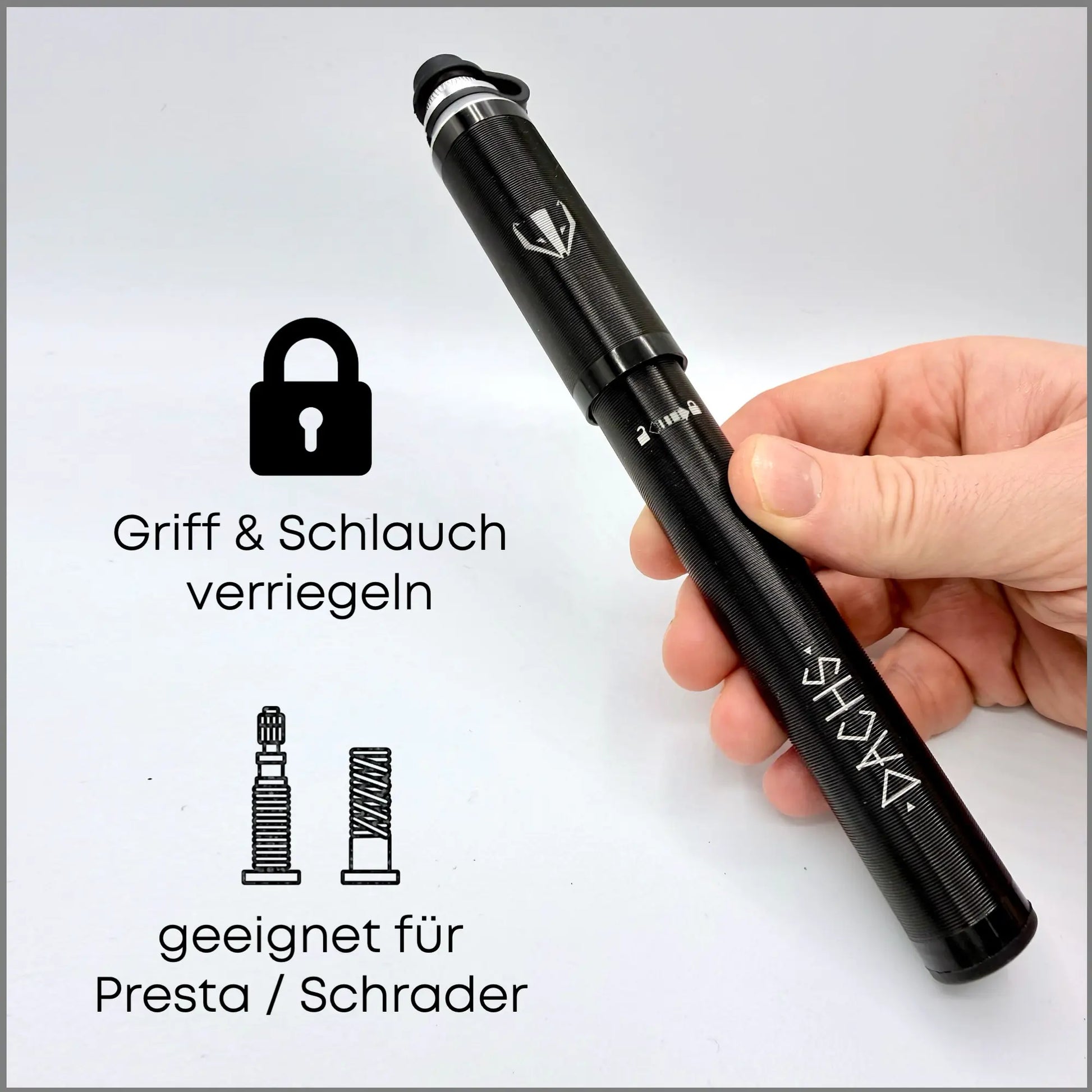 Der verriegelbare Griff hält die Pumpe sicher geschlossen, wenn sie nicht in Gebrauch ist – kompakt, robust und bereit für jedes Gravel-Abenteuer.