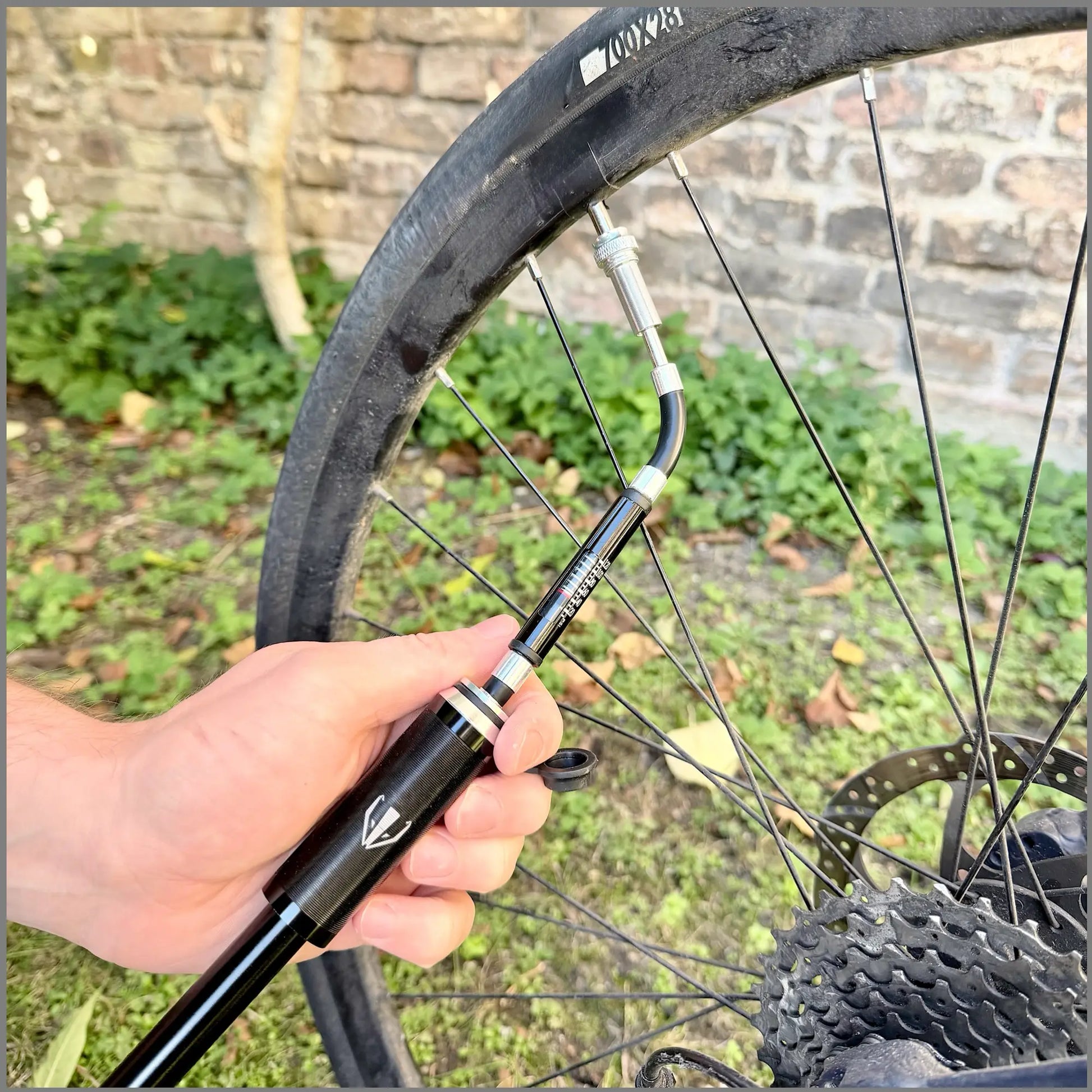Das robuste Stahlgehäuse und der ausziehbare, abgedichtete Schlauch sorgen für effizienten Luftdurchfluss und präzise Kontrolle in einem kompakten Design, das in jede Trikottasche oder Satteltasche passt.